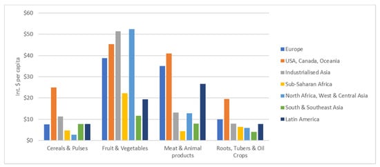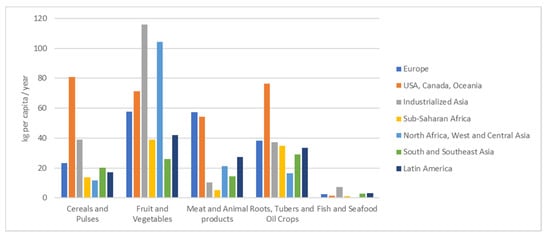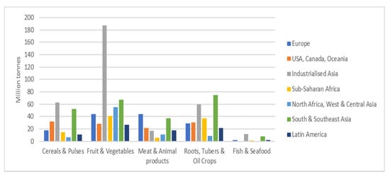 Figure 11 and Figure 12 show the lost economic value of food loss in terms of farmgate prices by commodity group and region in absolute value and expressed as per capita value. Of note is the high per capita value of ‘meat and meat product’ losses in Europe, North America/Oceania and Latin America and the high per capita losses of fruit and vegetables associated with higher- and medium-income regions, as well as North Africa, West and Central Asia.
