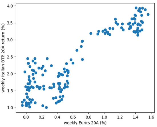 The Pooled OLS regression has been conducted regressing the weakly EURIRS 20A return collection of data (the dependent variable) on the weekly market component of the (BTP 20A) data. The historical series cover a three-year period, from 17 May 2018 to 6 June 2021.