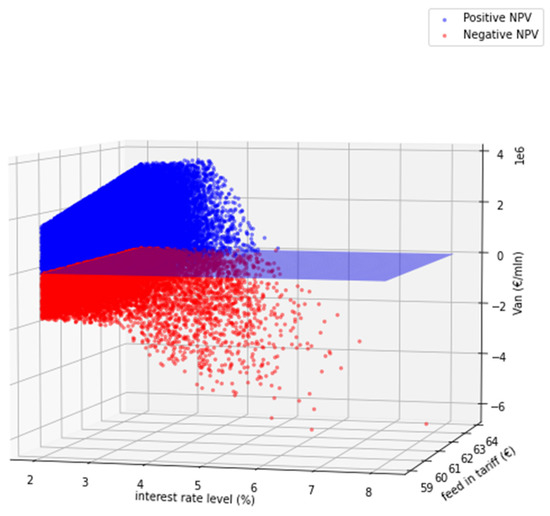 The results obtained, simulating 52,500 scenarios, are unpredictable. In the present condition of the market, the approximated (sampling) percentage of the negative NPV is 30.047%. In Figure 3, below, the dispersion of the random combinations is shown in a 3D plot.