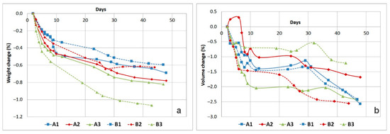 Weight was reduced in all cases (Figure 2a), especially during the first 20 days, with the final loss to range from 0.6 to 1%. The HCFA (A2) and LFS (A3) addition mainly affected the behavior of the mixtures after 20 days, slightly reducing the loss. Slag aggregates enhanced mass stability in the CEM (B1) and CEM-HCFA (B2) matrix, whereas they significantly reduced it in CEM-LFS (B3).