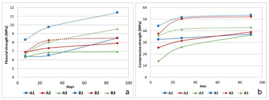 Respectively, LFS (A3) showed a higher strength development rate compared to that of A1, showing lower flexural strength final values (7 MPa) and the same compressive strength (58 MPa), according to former research work [31,41]. Slag aggregates also enhanced strength, however, at a lower level compared to that of compositions B1 and B2.