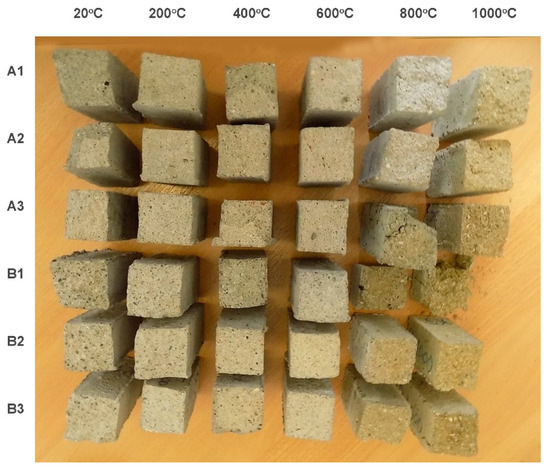 The structure of the specimens seemed to be maintained in most cases and at all tested temperatures, as presented in Figure 4. Up to 600 °C, their stability was kept, while at 800 °C, cracks were detected in all compositions except A2, which presented the better state. A1, A3, and B1 showed the worst condition. At 1000 °C, cracks were more intense in A1, whereas B1 almost lost its stability. Compositions A2 and B2 showed the better state, showing that the addition of HCFA retained the structural stability of mortars.