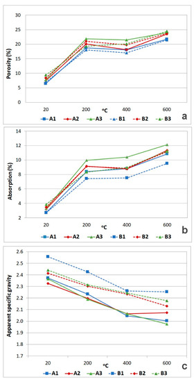 Porosity, absorption, and apparent specific gravity, measured up to 600 °C (Figure 6), showed almost the same trend for all compositions, with porosity and absorption to be significantly increased (up to 3 times) at the highest temperature. HCFA and LFS addition presented slightly higher values, compared to that of the reference mortar, whereas slag aggregates seemed to slightly reduce changes. Apparent specific gravity (Figure 6c) was linearly decreased for all compositions, around 10–15%. The highest decrease was recorded in the reference mortar (A1), while the lower reduction was shown in series B.