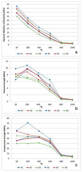 Flexural strength (Figure 7b) showed an increase at 200 °C (up to 45%), except for the case of LFS presence (A3, B3), with the higher increase to be reported in compositions A1 and A2. This phenomenon was testified by literature [17,18,21,33] and could be linked with the loss of free and capillary water, leading to a denser structure. At 400 °C, strength was almost at the initial level and was significantly decreased at 600 °C (around 30–50%). At 800 °C, all values were significantly reduced (around 85–90%) and were minimized at 1000 °C, attaining almost the 5% of the initial strength.