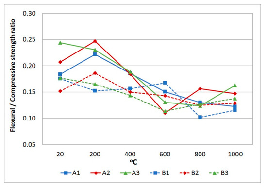 Flexural/compressive strength ratio of mortars exposed at elevated temperatures.
