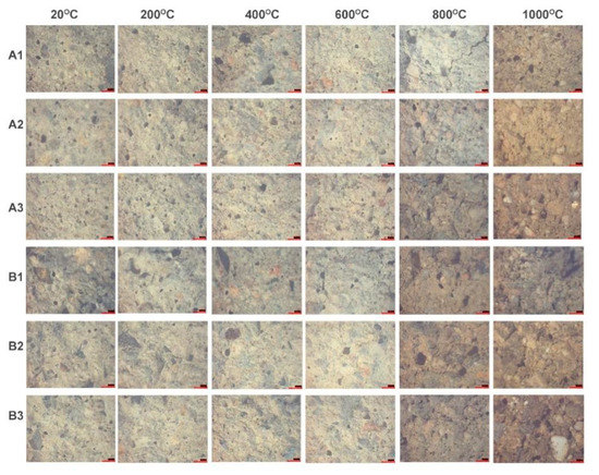 In this study (Table 5 and Figure 4), respective color changes were recorded at the heated specimens, ranging from Gley 1 7/light gray to 2.5Y 5/2 grayish brown. At ambient temperature, the color of series B was slightly darker, due to the slag aggregates’ presence. At 200 °C, the color became brighter, probably due to the humidity loss. It was maintained or became slightly darker at 400 °C, while at 600 °C, some grey stains were recorded in the surface of the specimens, linked with the CO2 combustion [21]. Internally, specimens presented a more uniform shade, however darker than that of 400 °C. At 800 °C, the hue became even darker, whereas it was more vivid compared to 400 °C, while at 1000 °C, a brownish hue was detected in all specimens.