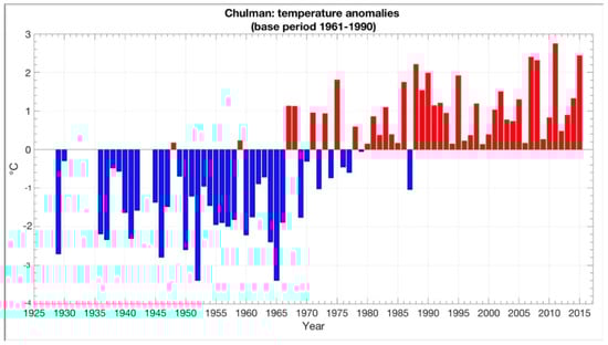 Climate change summarised on the basis of regional weather station data from Chulman (close to Iyengra). Bars indicate the temperature anomaly for each year 1929 to 2015, compared with a base period of 1961–1990. The anomaly is calculated as the annual average temperature minus the 1961–1990 mean temperature. Red bars indicate positive temperature anomalies (the annual average temperature is higher than the baseline mean) and blue bars indicate a negative anomaly (annual average temperature less than the baseline mean). These data were derived from Russian Academy of Sciences ground temperature stations with subsequent statistical analysis by Brie Van Dam, PhD, Snowchange.
