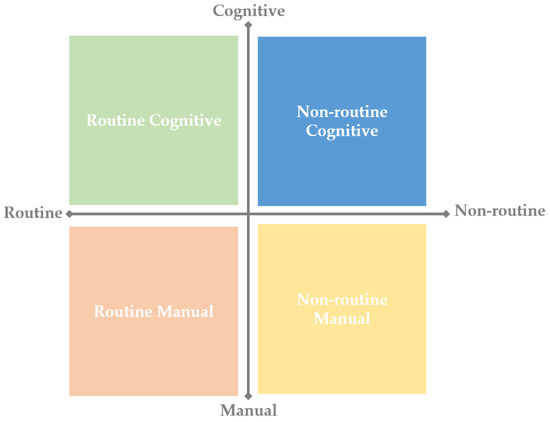 The virtual cognitive/manual and routine/non-routine space implemented for the characterization of occupations (adapted from [28]; Note that the quadrants colors are in consistency with colors in subsequent Figures 4 and 6).