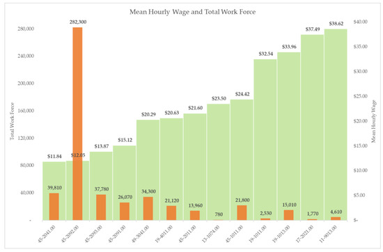 For the purpose of having a comprehensive assessment of the agricultural occupations landscape in terms of the nature of the occupations and the impact of robotization on the agricultural employment, the above-presented results should be mapped to the budgetary and workforce data for the corresponding occupations. For this purpose, Figure 3 was built from data (data refer to May 2017) available by the U.S. Department of Labor statistics, representing the mean hourly wage and total work force distribution of the examined occupations.