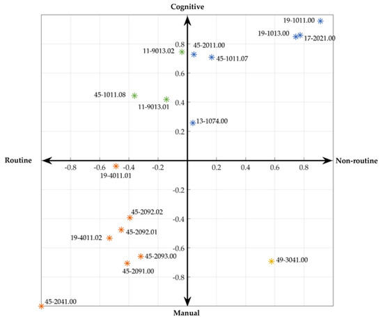 In the framework of this analysis, the larger the positive values of and (first quadrant of the graph—occupation of a non-routing cognitive nature), more skills are required for the occupation at hand to be performed in terms of education, perception, judgement, and experience. According to the present investigation, six occupations belong to this category, namely “animal scientists” (Code: 19-1011.00), “soil and plant scientists” (Code: 19-1013.00), “agricultural engineers” (Code: 17-2021.00), “first-line supervisors of agricultural crop and horticultural workers” (Code: 45-1011.07), “agricultural inspectors” (Code: 45-2011.00), and “farm labor contractors” (Code: 13-1074.00). According to the O*Net description, the execution of the tasks related to these occupations needs high expertise and a high level of education. More specifically, they are associated, for example, with conducting research in genetics, nutrition, growth, reproduction, and domestic farm animals’ development (“animal scientists”) as well as with examination of the composition of soils and decision making on the control of pests and management of plants, trees, and crops (“soil and plant scientists”). An occupation belonging in the first quadrant also requires knowledge of engineering to face with agricultural problems, such as agricultural products’ processing, electrification, water and soil, and conservation (“agricultural engineers”). Additionally, the responsibilities also include coordinating and supervising the operations of workers (“first-line supervisors of agricultural crop and horticultural workers”), hiring seasonal workers (“farm labor contractors”), and inspection of agricultural commodities and thus ensuring quality, health, and safety (“agricultural inspectors”).