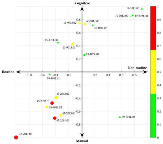 In order to provide a visual connection between the rate of susceptibility to robotization and the nature of each occupation, the above-presented results were incorporated into the occupations nature map generated in the previous section. Figure 5 depicts the resultant graph, where three (colored) zones have been also introduced indicating the level of susceptibility. The “green zone” represents the characterization of a low level of susceptibility (rate between 0 and 0.33), the “yellow zone” represents a medium level of susceptibility (rate between 0.34 and 0.66), and the “red zone” represents a high level of susceptibility (rate between 0.67 and 1). Furthermore, the size of the cycles in Figure 5 is proportional to the rate of the occupation.