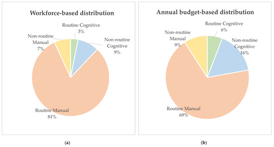 Based on the classification of the occupations relying on their nature as well as by considering the above-presented available data for the occupations’ share in the total work force, it can be inferred that 88% of the workforce executes tasks of manual nature carried out either in a routine manner (81%) or a non-routine one (7%). Furthermore, cognitive skills requirements prevail with 12% of the total work force, whose tasks are performed either routinely (3%) or non-routinely (9%) (Figure 6a). The corresponding annual budget of agricultural-related occupations account for 69% (stemming from occupations of manual routine nature), 9% (stemming from occupations of manual non-routine nature), 6% (stemming from occupations of cognitive/routine nature), and 16% (stemming from occupations of cognitive non-routine nature) (Figure 6b).