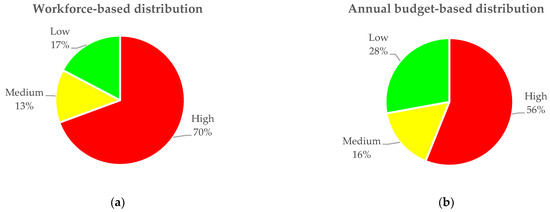 Workforce-based (a) and annual budget-based (b) distribution of the agricultural occupations in terms of their susceptibility to robotization.
