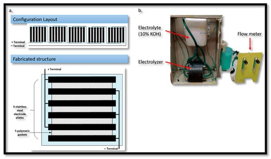 An electrolyzer as shown in Figure 2a,b was used with 30 plates of SS316 in such a configuration that they form six stacks comprising six cells each. From the literature it was established that the cells required from 1.8–2.2 volts [37] which depends upon the reversible thermodynamic decomposition voltage, anode over-potential, cathode over-potential and the inter-electrode Ohmic drop. The characteristic size itself is dependent on the cell configuration (such as cell and electrode geometry) and operational parameters (such as current density, electrolyte flow conditions, temperature and pressure). As the electrolyzer under investigation is comprised of six cells in each stack so it required between 11 volts to 13.2 volts for efficient working.