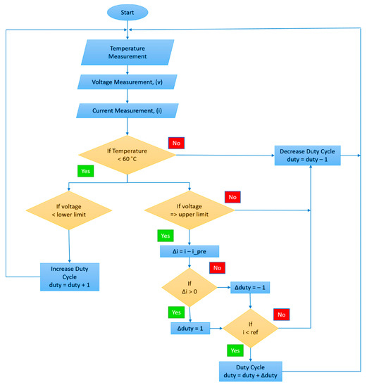 Normally for MPPT strategies of solar PV, monitoring of the parameters is done for PV in order to track the maximum power obtained from it. As the current system is a standalone and the electrolyzer is expected to work in its operating region as mentioned in Table 2, so this strategy was implemented in the electrolyzer by monitoring its parameters (current and voltage). This was done because the electrolyzer is required to run on the maximum available current (if under electrolyzer limitation of current) regulated by the operating voltage. Another reason to implement a control technique on the electrolyzer, because the electrolyzer itself is a non-linear load, so it is important to monitor the electrolyzer parameters in order to run it for maximum production of HHO gas. This control technique is represented in the flowchart shown in Figure 6.