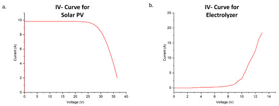 To determine the characteristics of the electrolyzer as well as PV, IV testing was performed to see the working behavior of the PV and electrolyzer. The IV curves of the solar PV and electrolyzer based on the tests, are shown in Figure 7a,b, respectively. From Figure 7b we can easily analyze the operating parameters of the electrolyzer.