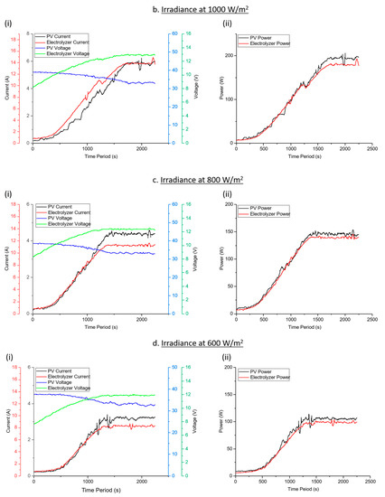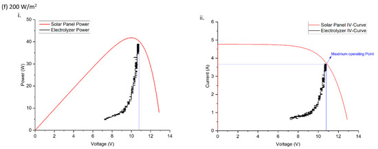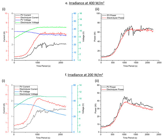 After 200 W/m2 of irradiance, the PV system was unable to provide enough power for keep the electrolyzer working in its operating region. Although at this level of irradiance, the DC-DC convertor tries to keep the electrolyzer operating, the electrolyzer does not operate (Figure 9f(i)) shows that less than 10.7 Volts are available for electrolyzer).