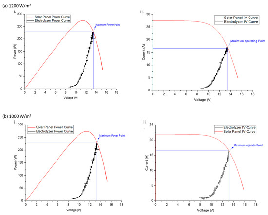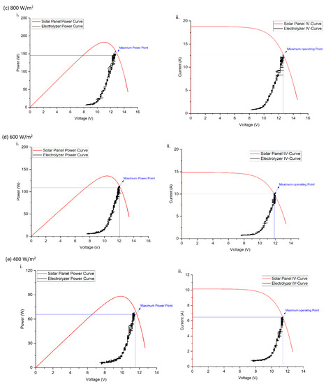 It is also seen from Table 3 that the maximum efficiency of the convertor is available when the solar PV is working in the electrolyzer operating range. Furthermore, IV-curves and power curves were analyzed to see the behavior of the working of the electrolyzer with the solar PV. Power curves and IV-curves were drawn in Figure 9 by keeping in view the actual data of the PV and the duty of the convertor at the respective irradiance in order to correlate the analysis with the electrolyzer curves. From Figure 9 it is more clearly seen that the convertor kept the electrolyzer to its operating region while tracking the maximum power of the PV. In all (i) parts of Figure 9, maximum point of power is tracked for a particular irradiance while keeping the electrolyzer in operating mode. On the other (ii) part of all figures in Figure 9, IV curve is drawn while displaying maximum operating point for electrolyzer. It can also further have determined from Figure 9, that control strategy for the convertor is not analyzing maximum power point of PV (in Figure 9, tracked power point is not on the tip of curve for this system as happens in case for traditional MPPTs) as it is dependent on operating region of electrolyzer as shown in Table 2. So it is determining the maximum operating point of electrolyzer from available PV power.