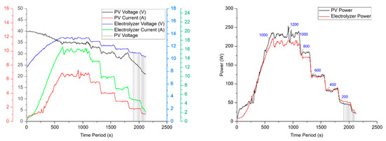 From Figure 9 it can be seen that after a certain irradiance (in the experiment it was below 200 W/m2) the PV panel is not able to provide enough power for the electrolyzer to be in the operating region (the non-operating region is shown by shading). The same can be seen for higher irradiance, even though at 1200 W/m2 more power was available for the electrolyzer and the convertor was keeping the electrolyzer in its region of operation (i-e 10.8–13.2 Volts and 15 Amps).