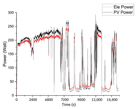 Finally, a test of four hours under Sun irradiance was performed to see the behavior of the convertor and electrolyzer due to intermittency. The power of the PV system was recorded for each interval of time depending upon the intermittent nature of solar irradiance along with the power delivered to the electrolyzer due to convertor keeping the electrolyzer in its operating region. From Figure 11, it can be seen that the convertor is tracking and delivering the maximum power available in the PV system by keeping itself in the operating region of the electrolyzer. It was also concluded that at some instants not enough power is available from the PV system to energize the electrolyzer so in that instance the electrolyzer is not in its operating region and hence no HHO is produced.