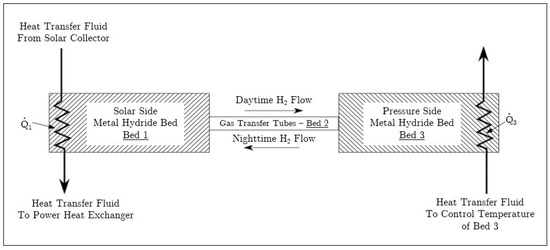 A schematic of the tandem bed system is shown in Figure 1. In the figure, Beds 1 and 3 contain metal hydrides and represent the high and low-temperature beds, respectively. The gas transfer tubes between the high and low-temperature beds are designated as Bed 2 and are solely for transporting gas; these tubes do not contain metal hydride. [W] denotes the net heat transfer to Bed 1 and includes solar heat entering the bed as well as heat transfer out to the working fluid. Similarly, denotes the net heat transfer to Bed 3, which can include process waste heat used to enhance hydrogen discharge from Bed 3. Beds 1 through 3 are a closed system and operate without addition of hydrogen, pumps or other externally applied work.