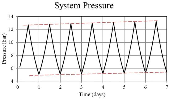 System pressure for the non-thermally balanced system. Operation of the non-balanced system results in an upward trend in the system pressure.