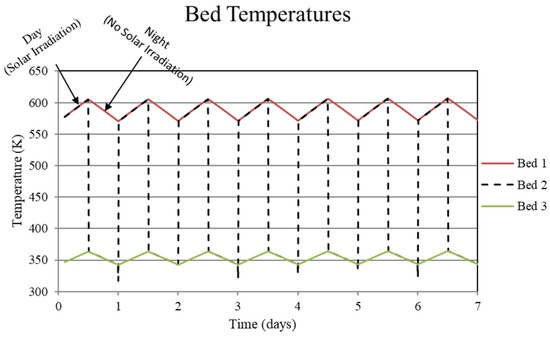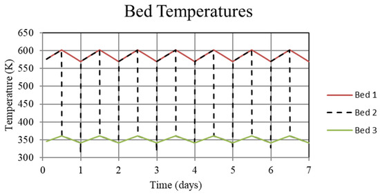 System temperatures for the high-temperature metal hydride, Bed 1, the connecting pipeline, Bed 2, and the low-temperature metal hydride, Bed 3, for the thermally balanced system. For this case, temperatures in both Bed 1 and Bed 3 are periodic after the first few cycles.