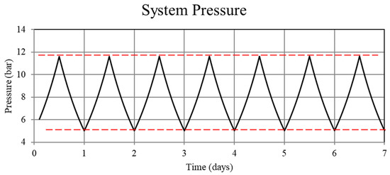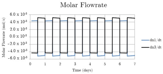 In the scoping calculations two cases were considered. The first case, referred to as ‘a non-thermally balanced system’, sees 300 W of solar heat transferred to the metal hydride in the high-temperature bed (Bed 1) during the day and 300 W extracted from the high-temperature bed during the night, i.e., W. The day and night portions of the complete 24 h cycle are each assumed to be 12 h long and the power is assumed to be constant over each part of the cycle. For this case there is no heat transfer, other than that by convection of hydrogen, to or from the low-temperature bed (Bed 3), i.e., W. The piping that connects the high and low-temperature beds is assumed to be adiabatic. The performance of the system for this case is shown in Figure 2, Figure 3, Figure 4, Figure 5 and Figure 6.