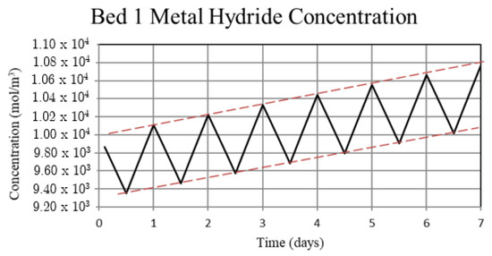 For Case 1, in which the system is not thermally balanced, cyclic operation results in accumulation of hydrogen in the high-temperature bed and depletion of hydrogen in the low-temperature bed. In this paper, the accumulation/depletion process is referred to as “thermal ratcheting” and is shown as the cycle to cycle increase in the metal hydride concentration in the high-temperature bed accompanied by a decrease in the low-temperature bed, see Figure 5 and Figure 6. Eventually, when the high-temperature bed can no longer uptake hydrogen, discharge from the low-temperature bed continues until the system reaches temperature dependent equilibrium pressure of the low-temperature bed. This situation defeats the purpose of generating heat via reaction enthalpy in the high-temperature bed as the bed will no longer uptake hydrogen. After saturation, the only heat generation in the high-temperature bed will be due to pure pressurization, which is insufficient to supply the necessary power during the night.