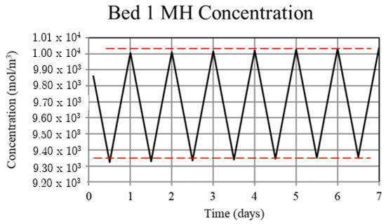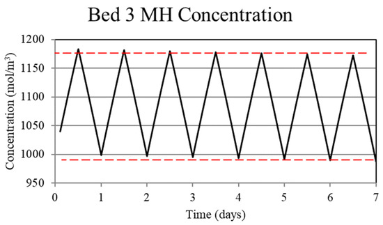 Understanding the mechanism for the thermal ratcheting effect leads to an immediate means for its mitigation, which is the basis for the thermally-balanced model of Case 2. Here, the 30 W of heat removal from the low-temperature bed, Bed 3, during the day reduces the bed temperature and thus increases the hydrogen uptake. The reduction in the heat removed from the high-temperature bed, Bed 1, during the night to 270 W as opposed to 300 W for the Case 1 model, serves to prevent the bed temperature from decreasing over the uptake part of the cycle as much as in Case 1. As a consequence, the increased Bed 1 temperature reduces the hydrogen uptake. Taken together, operation under these conditions results in cycle-wise stabilization of the hydrogen content of the high and low-temperature beds after a few cycles. This is shown in Figure 10 and Figure 11 where the hydrogen content of the beds is represented by the metal hydride concentration. From Figure 8, it can be seen that operating in this way maintains a periodic temperature cycle in both beds. Operation under the conditions of Case 2 result in a viable thermochemical system for solar energy storage.