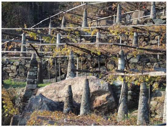 The area is distinguished by a continuity of terraces, where the microclimate has favored the formation of a particular agricultural landscape featuring stone-walled terracing as well as an historical vine-growing. This setting also boasts the characteristic tupiun, pilun and balmetti: rural architectural elements of traditional agriculture activity able to produce—as a whole—a clearly identifiable and identity-making system. The use of terraces has changed over time, and as in other mountain areas, there has been a partial and gradual abandonment that led them to spontaneously grow wild. Nevertheless, over the past few decades, the desertion of the economic boom was followed by a conversion of former vineyards, especially replaced by other crops such as olive trees. What makes this territory similar to the others—despite the roughness of its slopes—is vine-growing on pergolas, whose intricate constructions became known as “topiary architecture”. The technique is extremely complex and has a strong visual-perceptive impact with a clear value in terms of identity. Indeed, the historic and cultural value of terraces in the Alto Eporediese area finds a unique expression in the pergola vine-growing system nicknamed “valdostana” (see Figure 2), shared with nearby towns of the adjacent Aosta Valley Region, although the system is also popular elsewhere and for other crops [20].