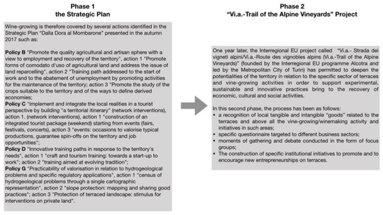 In 2018, one year after the presentation and adoption of the Strategic Plan by the municipalities involved, the inter-regional EU project called “Vi.a.- Strada dei vigneti alpini/Vi.a.- Route des vignobles alpins (Vi.a.- Trail of the Alpine Vineyards)” (founded by the inter-regional EU programme Alcotra and led by the Metropolitan City of Turin), has provided the opportunity to generate territorial policies. In particular the project—whose goal has been to promote and protect the Alpine vineyard landscape and winemaking activity in Italy and France—has provided the opportunity to focus on three small municipalities included in the strategic plan: Carema, Settimo Vittone, and Nomaglio. Here, the project has allowed the deepening of the potentialities of the territory in relation to the specific sector of terraces and vine-growing activities, in order to support experimental, sustainable and innovative practices to bring about the recovery of economic, cultural and social activities.