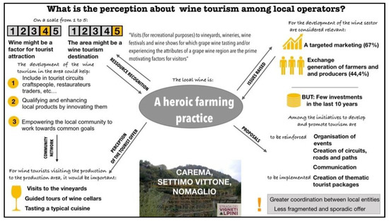 In general, the territory analysed in the case study shows a strong interest and activism in working to create communities and creating occasions and initiatives to strengthen local networks or develop extra-local networks [30]. This combines with the interest to define a method to recognize the territory and its products, as well as sharing local products among businesses. Local operators perceive it as an area with a strong wine-tourism potential. Both the area’s value as a tourist destination and the terracing/wine resource—described as a “heroic” practice—are fully recognized. Among the aspects considered most relevant to the development of the vine-growing and winemaking sector in each area of production, there is—on the one hand—the demand related to the commercial aspect, for which a specific territorial marketing strategy to attract tourists and local shops is considered a priority; on the other hand, there is the demand more closely linked to the area of know-how transmission between winemakers and generational renewal.