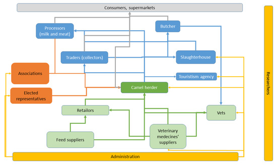 Recognizing the traditional and ongoing collective action at the community and sectoral level, our objective in the present paper is to explore and characterize the links between the main stakeholders in the camel sector that are the premises for the conception of a systemic organization within the CARAVAN Projects. For that, we proposed to characterize the interactions between actors in two dimensions: horizontal links with the peers (intra-relations) and vertical links between the different kinds of stakeholders along the value chain and in resource management (inter-relations). We used a semi-structured questionnaire in four northern and southern Mediterranean countries to identify the roles and relationships of stakeholders along the value chain and the main constraints and opportunities perceived by the actors concerning the organization of the sector. This paper is the first representation of the social network of the dromedary camel sector and is intended to provide a basis for reflection about a more structured organization of the chain while considering the main existing channels of communications and exchanges.