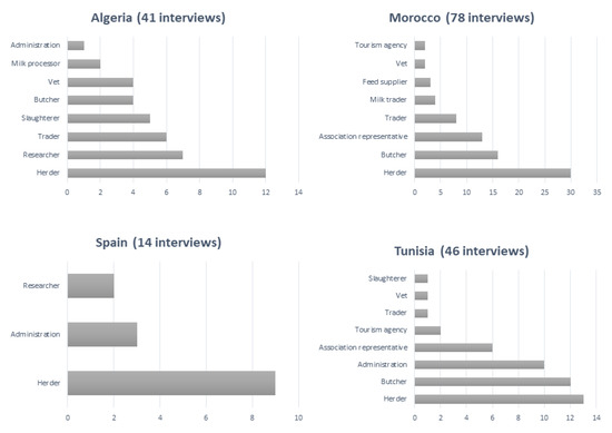 The majority of interviews were conducted face-to-face by national research teams and students in each country in the local dialect. In average each interview required around 30–45 min. In Algeria, a digital questionnaire was used to reach some administrative or technical staff in very remote areas. Four countries were investigated: Morocco, Algeria, Tunisia, and Canary Islands (Spain). A total of 179 stakeholders were interviewed, including camel herders, butchers, traders, feed providers, vets, administrative staff, local representatives, slaughterhouse managers and staff, and researchers. Except in Spain where has been realized an exhaustive survey among the stakeholders, the sampling method was based on the snowball sampling approach in each location.