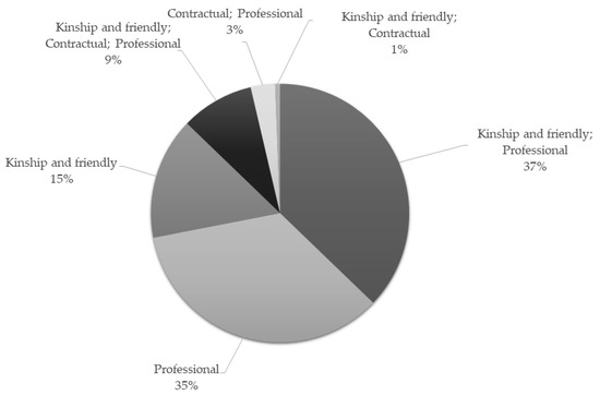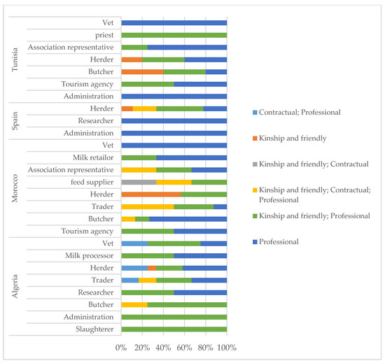 The descriptive analysis of the relationships between the different stakeholders in the camel sector and their peers revealed the importance of the nature of family or friendly links alone (15%) or linked to professional or contractual interactions (49%) (Figure 3). For the actors downstream or upstream of the production level, some differences in the peer relationships were observed in each country (Figure 4). Kinship relationships mainly concerned camel herders in all four countries. A gradient ranged from only or mostly kinship and friendly relationships to only professional links from Tunisia to Morocco in the case of butchers. The majority of contractual relationships between peers were observed in Algeria among herders, traders, and vets, where stakeholders managed their activity based on contracts (mainly oral). Most of the relationships between stakeholders in the administration or veterinary services were professional but included no specific contract.