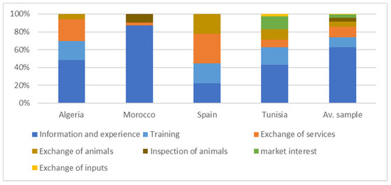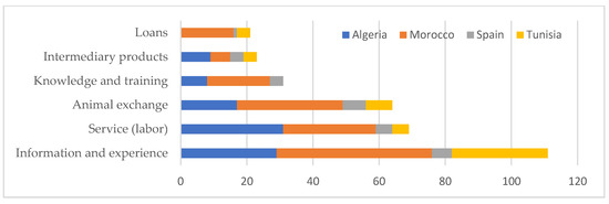 The main nature of exchanges (both given and received) between peers concerned the transfer of information and knowledge (35% of the exchanges) and, to a lesser extent, the exchange of services (labor) and of animals (Figure 5). Figure 5 reveals contrasting types of interactions between peers in each country. For instance, in Tunisia, the majority of the exchanges were limited to the exchange of information and experience with a few exchanges of goods and services, whereas in Morocco and Algeria, exchanges of animals or services (mainly labor) were common between peers, especially between camel herders. Trade in animals or inputs and services are also common between herders in Spain, where camel herders want to improve their breeding program.