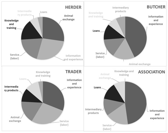 Nature of the given and received exchanges between peers for four main stakeholders (158 exchanges between herders, 42 between butchers, 29 between traders and 23 between association’ leaders).