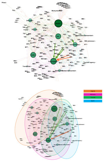 The color of the outline of each ellipse reflects the dominant network in each country. Notably, the vets’ strategic cluster, feed suppliers, and traders dominate in Morocco (in pink). Contacts between vets, feed suppliers, and the administration dominate in Tunisia (in green). A particular link was observed between vets and milk processors in Algeria in connection with the expanding milk sector (in orange). In the Canary Islands (Spain), there was a different configuration centered on the administration and researchers. Appendix A gives a specific representation for each country.