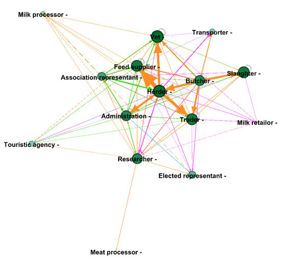 When only the categories (and not the individuals) were considered, camel herders, located at the center of the network, represented the main point of contact for all the other actors. Consequently, they play a structural role in the organization of the camel sector (Figure 10). The herders’ closest relations were with the feed and medicine suppliers and vets downstream in the value chain and with the butchers and traders upstream in the value chain. However, the main direction of the links downstream in the camel value chain is directed away from the stakeholders in charge of valorization of the camel products to the producers, i.e., herders, and not inversely.