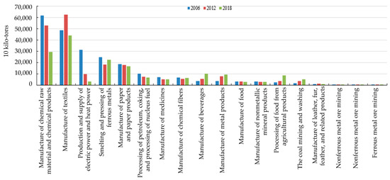 Pollution emissions of key industries in 2006, 2012, and 2018 (industrial wastewater). Source: Authors calculation based on the Statistical Yearbook of Jiangsu (2007, 2013, and 2019).