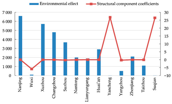 Environmental effect and structural component coefficients attributable to the industrial growth for each prefecture-level city between 2015 and 2018. Source: Authors calculation based on the Statistical Yearbook of Nanjing, Suzhou, Wuxi, Changzhou, Nantong, Taizhou, Yangzhou, Zhenjiang, Yancheng, Xuzhou, Huaian, Lianyungang, and Suqian (between 2016 and 2019).