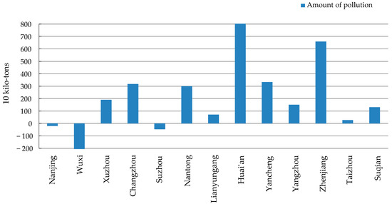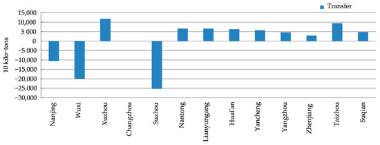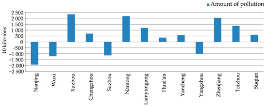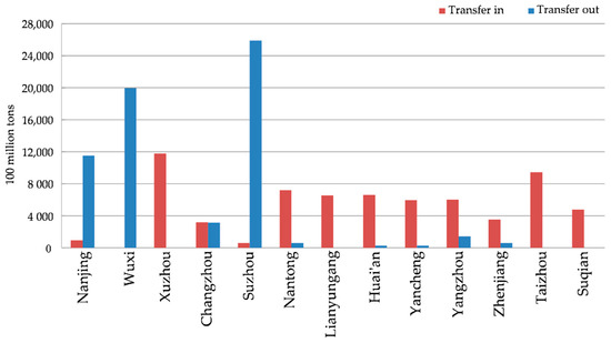 Figure 6 indicates that among Jiangsu’s prefecture-level cities, Suzhou, Wuxi, Nanjing, and Changzhou had the highest amount of transferred-out pollution. Most of these cities are prosperous and have undergone notable changes to their industrial structure.
