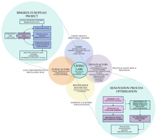 The investigation process that was adopted is shown in Figure 1. The necessary balance between the four helices of the system (users, public actors, private actors, and knowledge institutes) are presented as required by the Living Lab strategy. The application to the BIM4Ren project and the methodology that was applied to collect and process the data is highlighted, as well as the main intended goal of the investigation looking to identify ways to improve the currently used renovation processes.