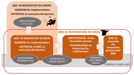 The methodology is based on an open innovation approach focused on Living Labs (LL), as part of the insight that was adopted by the BIM4Ren project. The information that is obtained is devoted to analyse the requirements for the use of BIM in renovation, driven through the active end user’s participation and involvement in the LL. Therefore, the LL activities enable direct feedback from the pilots’ agents, key stakeholders, and targeted beneficiaries throughout the project. In this way, it ensures that the user-centered developments are focused on the real needs and requirements through enquiries to the key stakeholders. In addition, the different insights allow the identification of the barriers and opportunities of BIM by the type of stakeholder with the goal of addressing them separately.