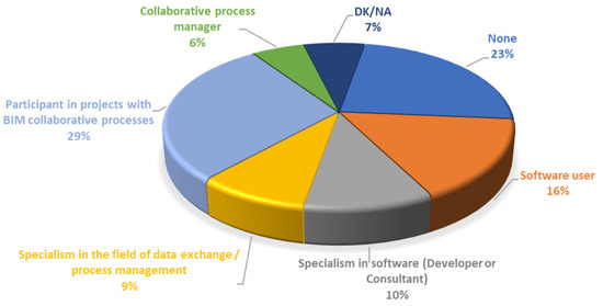 - Most of the respondents have participated in projects with BIM collaborative processes (52%), 18% were declared as BIM software users, and 20.5% had no experience with BIM. The rest were related to BIM as software developers as well as in the fields for research. These outcomes might be partially biased in comparison with the general sector due to the profile of the companies that are interested in this type of questionnaire, and they do not represent the current situation regarding digitalisation. There is still a challenge for further digitalisation even in the companies that state that they use BIM.