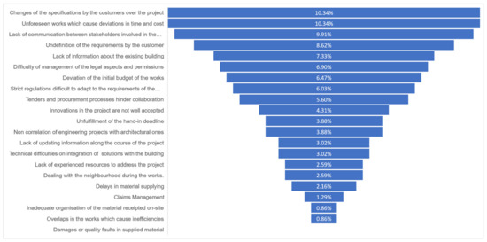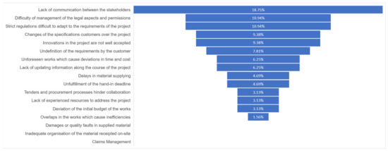 The results that were obtained from the answers allowed the identification of common problems that have a significant impact on the stakeholders’ businesses, differentiating new construction projects (Figure 5), and renovation projects (Figure 6).