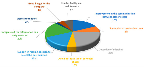 The survey provided valuable information about the user’s perspective regarding the potential of digitalisation to face the inefficiencies of the renovation process. The current section gathers the main findings of the survey regarding these topics that were related to the opportunities of digitalisation, particularly the BIM, for enhancing the renovation process. The charts below represent the distribution of the answers according to those topics related to digitalisation (Figure 7, Figure 8, Figure 9 and Figure 10).