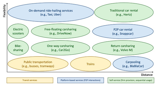Shared mobility includes diverse forms of carsharing, bikesharing, and e-scooters services (i.e., “micro-mobility”), carpooling, taxi and on-demand ride services (e.g., ride-hailing), alternative transit (e.g., “paratransit”, shuttle services), and private transit services (e.g., “micro-transit” services using vans and mini-buses) that supplement traditional public transit services [1,2]. These services enable people to access mobility on a “as needed basis” [3]. Shared mobility can be viewed as a tool to reduce congestion on the roads, reduce transportation infrastructure, reduce CO2 emissions and the environmental impact of traveling, and reduce financial costs when compared with individual private ownership of vehicles. The shared use of transportation mode is possible on trips with a wide range of distance, and it varies in flexibility (see Figure 1). Nowadays, Mobility-as-a-Service (MaaS) operators leverage this large diversity of mobility services from different providers and combine them into a single digital platform (i.e., a mobile app) to address the transportation needs of people in a user-friendly manner and based on a pay-as-you-go subscription pricing model. Such innovations in the mobility sector are considered as a way to increase accessibility to daily activities, with the potential to increase people’s wellbeing while reducing the environmental impact of daily travels.