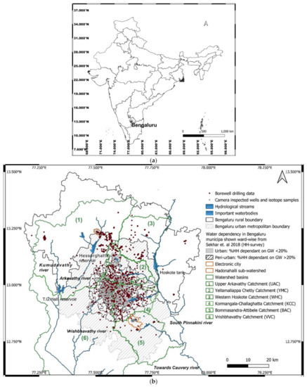 With an estimated 250 km3/year, India is the world’s largest groundwater user [9]. The lack of conjunctive management and infrastructure, but also insufficient wastewater treatment, is blamed for the country’s growing urban groundwater problem [10,11]. Moreover, in many cases, little is known about characteristics of the aquifers [12]. In particular, the hard-rock aquifers, which cover two-thirds of the country, are characterized by local heterogeneity whereby the role of preferential flow paths (due to fractures) for the capture and use patterns remain poorly understood [12,13]. In the peri-urban areas of the Deccan Plateau, over-exploitation of groundwater has led to the drying up of natural streams such as the Arkavathy River, adjacent to Bengaluru city [14,15,16]. Farmers in peri-urban areas were noted to dig deeper wells than in rural areas, with the backup plan of selling their lands if they run out of water [17,18]. However, hard data on the development of the groundwater table in the thousands of deep wells drilled over the last two decades are missing, and monitoring is limited to a few shallow wells, which are often disconnected from the real groundwater table [19,20]. Despite the government’s campaign to ban new borewell drillings and a mandate to register existing borewells, the city continues to rely on its growing number of ~500,000 illegal wells, of which an unknown number are abandoned [21].